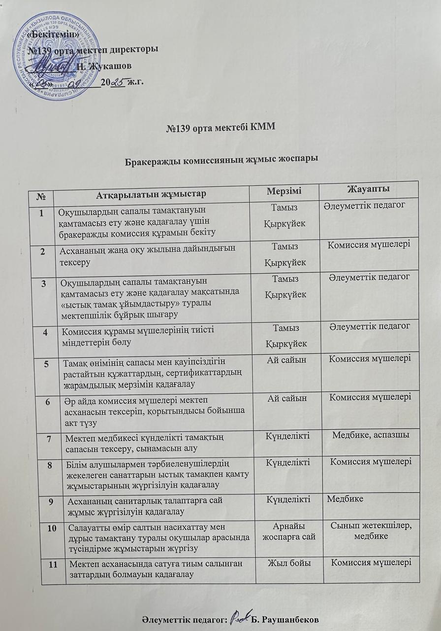 05 сентябрь 2025 0 1 2 3 4 5 Бракераж комиссия, Бұйрық хаттама, Бракераж жоспар, Тамақтану кестесі, Кезекшілік, Бастауыш сынып тамақ бұйрық