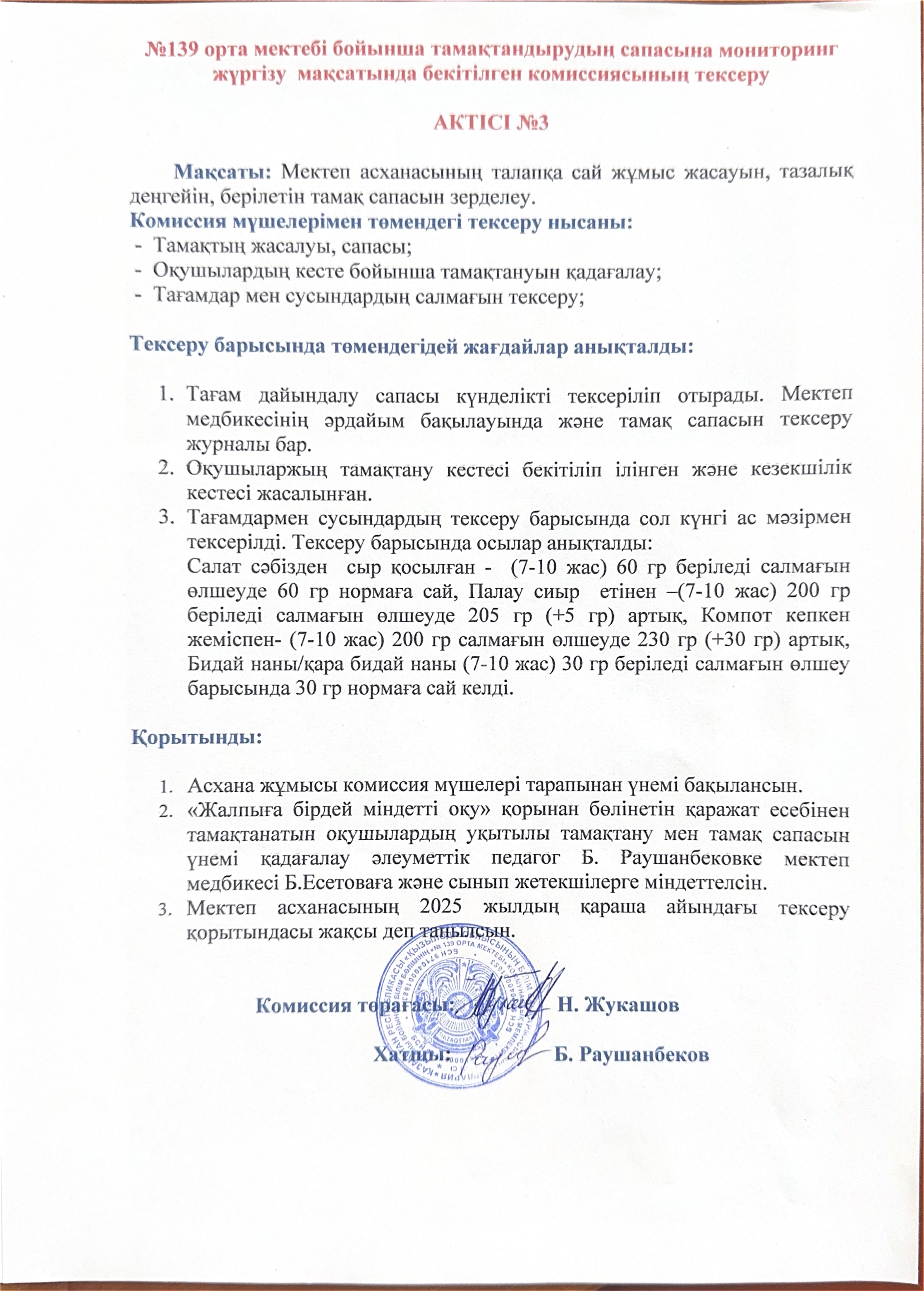 Тамақтандырудың сапалық мониторингі Қараша айы 14.11.2025 жыл » №139 орта мектеп