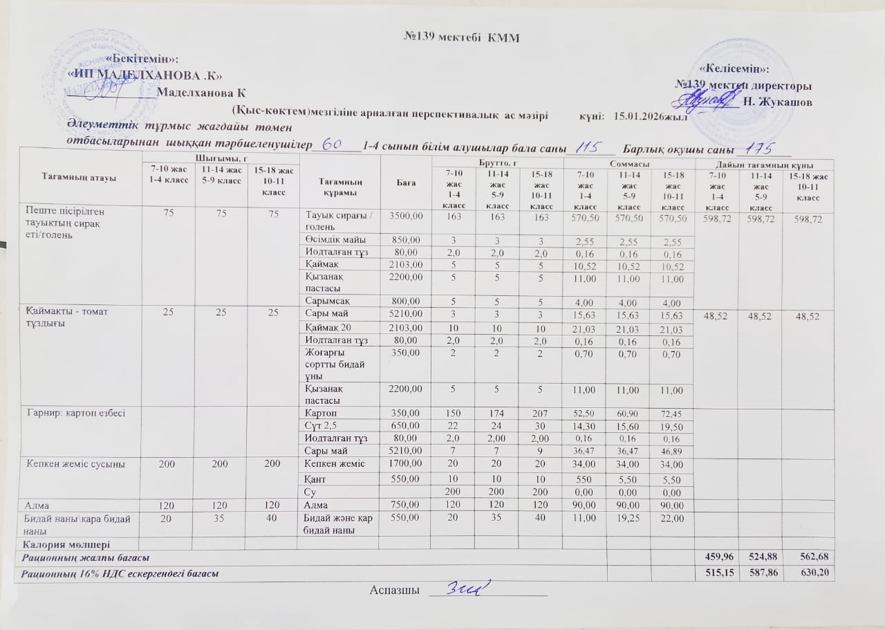 Ас мәзірі 15.01.2026ж » №139 орта мектеп